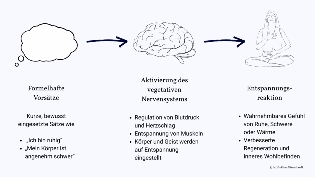 Die Übungen wirken über das vegetative Nervensystem, das unbewusst Körperfunktionen wie Atmung, Verdauung oder Herzschlag steuert. Während der Sympathikus den Organismus in Alarm- und Aktivitätsbereitschaft versetzt, sorgt der Parasympathikus für Entspannung, Regeneration und Erholung. Das Autogene Training aktiviert gezielt diesen beruhigenden Anteil, wodurch typische Entspannungsreaktionen entstehen – etwa ein Gefühl von Wärme, Schwere, verstärkter Speichelfluss oder ein ruhigerer Herzschlag.